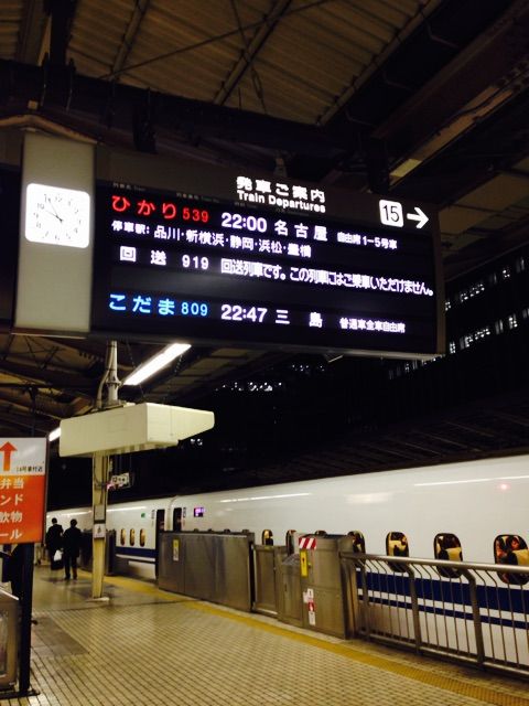 2015 12月 16 22:08:53 名古屋行き最終「ひかり539号」 カテゴリ: 出張 二日連続東京で忘年会。 昨日は会社ので、今日は競合を含めた業界のやつ。 本当は競合と飲み明かすつもりでホテルまで取ってたんだけど、明日朝イチで打ち合わせが入ったので泣く泣く帰ることに。 最初は東京21:23発の最終のぞみで帰るつもりだったんだけど、盛り上がってしまったので東京22:00発の最終ひかりに変更。 こういうときに何回でも変更可能なエクスプレスカードは便利ですね(^_-) 明日1日頑張って、金曜日は鹿児島へ飛びます♪(´ε` )